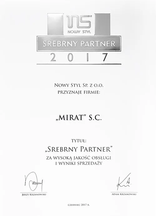 Z przyjemnością informujemy, że sklep Mirat.pl po raz kolejny został uhonorowany tytułem SREBRNY PARTNER firmy NOWY STYL, tym samym został uznany za partnera wykazującego się zrozumieniem potrzeb klientów oraz solidnego płatnika.