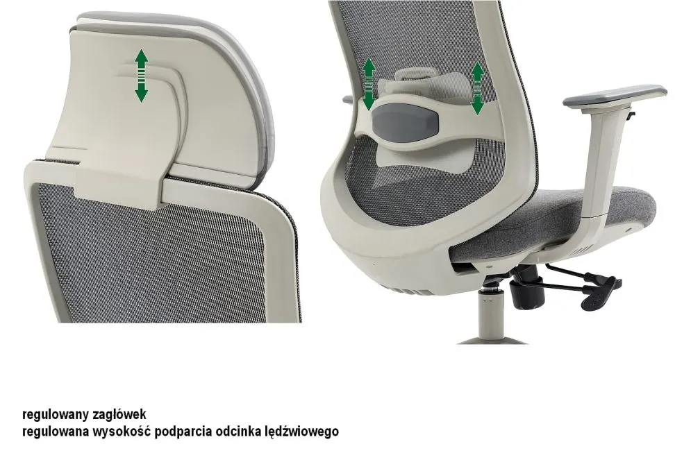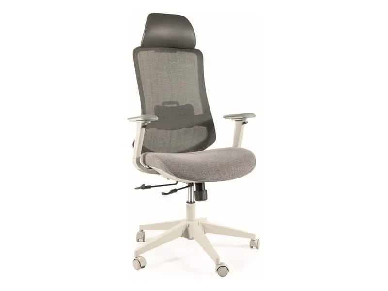 - tapicerka: tkanina, skóra syntetyczna i siatka w kolorze szarym,