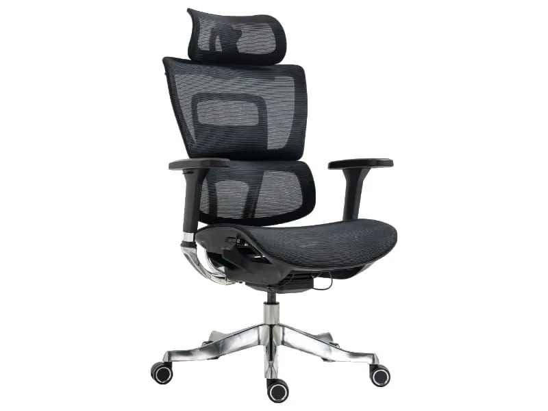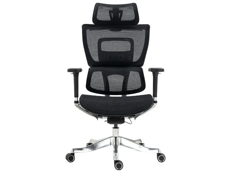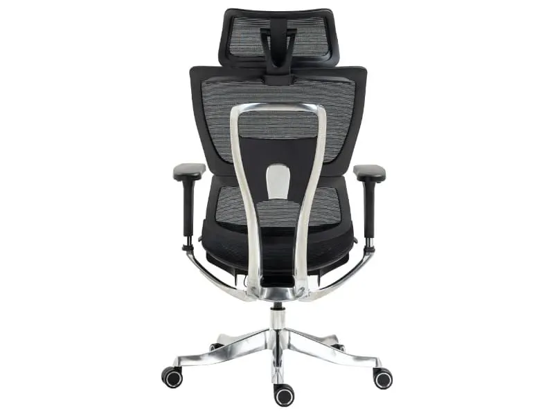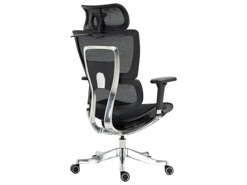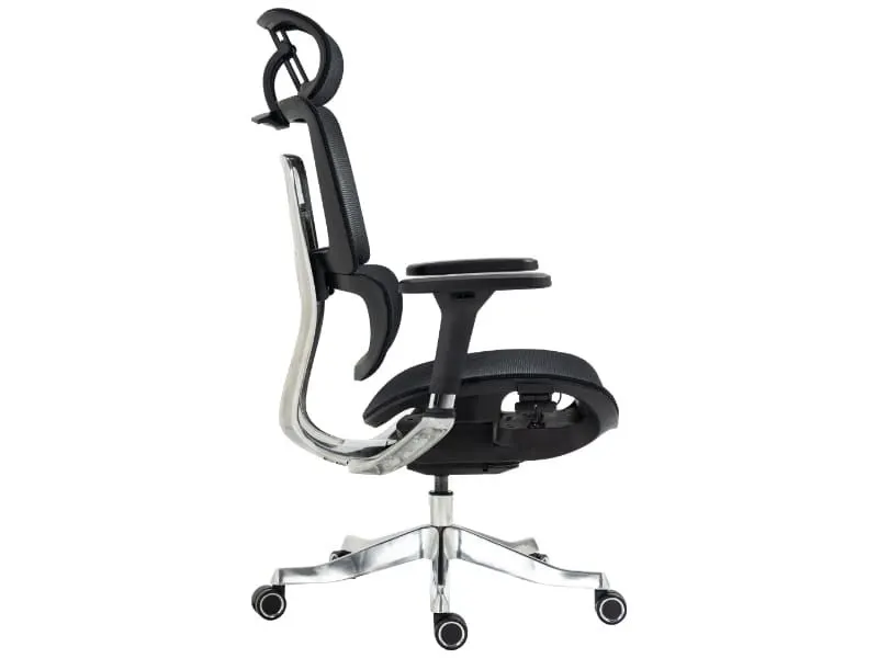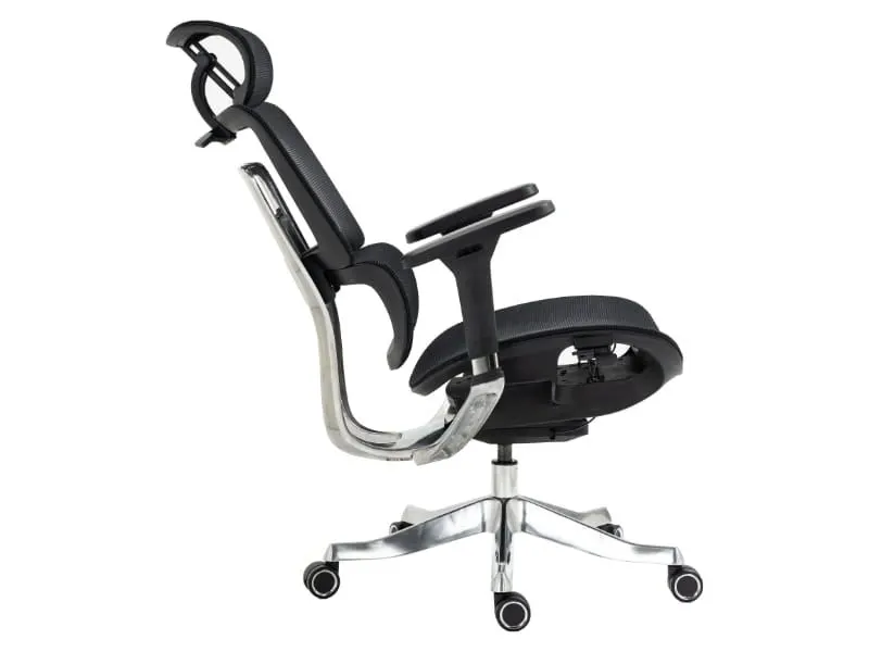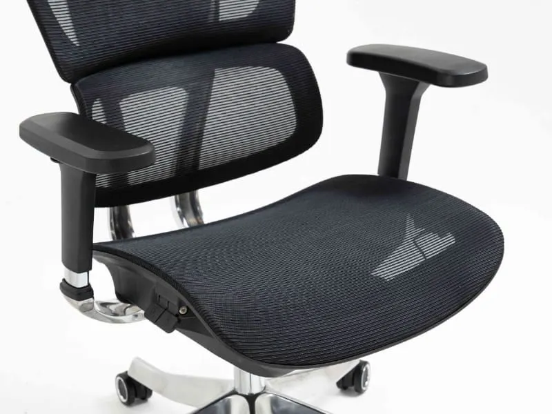 Siedzisko wykończone siatką posiada zaokrągloną, lekko pochyloną krawędź przednią, która eliminuje ucisk i zapobiega drętwieniu nóg. Regulacja głębokości siedziska (+/- 5 cm) pozwala na optymalne podparcie ud, szczególnie u wyższych użytkowników. Oparcie z elastycznej siatki, wyposażone w tzw. muldę lędźwiową, dba o prawidłowe ułożenie kręgosłupa. Dzięki regulacji wysokości (+/- 8 cm) i regulowanemu zagłówkowi (+/- 6 cm), każdy użytkownik może znaleźć idealną pozycję.