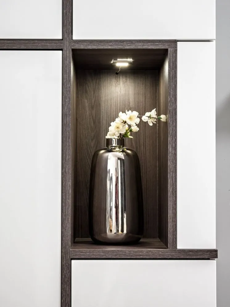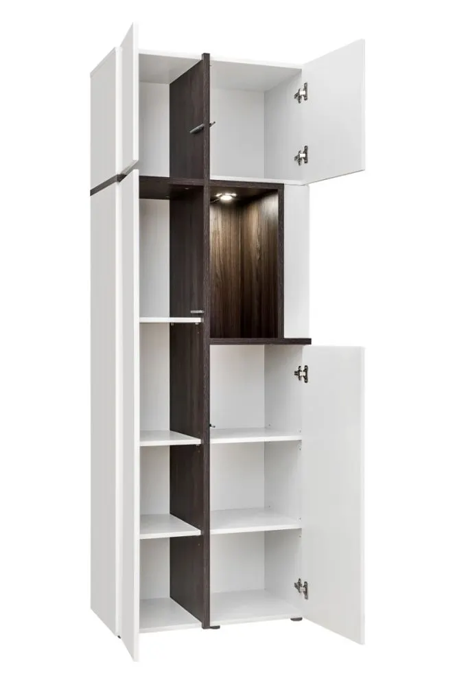 - Witryna wysoka: Oferuje dodatkową przestrzeń użytkową i ekspozycyjną. Połączenie bieli z podświetleniem LED, nadaje wnętrzu elegancji.