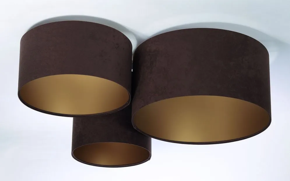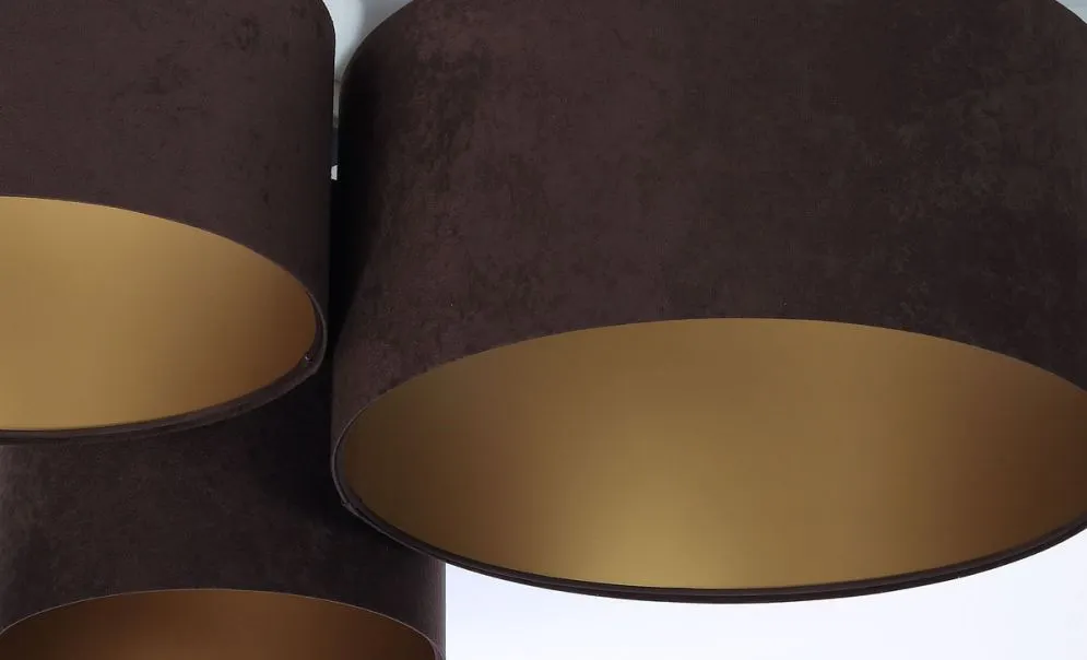 Abażury zostały mistrzowsko wykonane z trwałego tworzywa sztucznego, a następnie pokryte luksusową tkaniną welurową w głębokim odcieniu brązu. Aksamitna faktura materiału dodaje głębi i ciepła, a jednocześnie jest niezwykle praktyczna. Wnętrze abażurów wykończone jest złotą folią, która jest kluczem do luksusowej atmosfery. Złoty środek nie tylko efektownie odbija światło, ale także zabarwia je na ciepły, miodowy odcień, tworząc niezwykle nastrojowe i przytulne oświetlenie w całym pomieszczeniu. Wyposażony w oprawy na trzy żarówki, plafon z łatwością zapewni optymalne i nastrojowe oświetlenie.