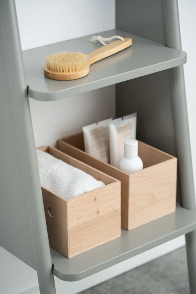 - trzy drewniane skrzynki na akcesoria łazienkowe; dwie stopki na nogach drewnianych