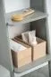 Konstrukcja regału opiera się na solidnych nogach z litego drewna bukowego, które zapewniają stabilność i dodają całości ciepła. Cztery półki o zróżnicowanej głębokości pozwalają na przechowywanie zarówno większych przedmiotów, jak ręczniki, jak i mniejszych akcesoriów. W komplecie znajdują się trzy drewniane skrzynki, które pomogą Ci zapanować nad drobnymi kosmetykami i utrzymać idealny porządek.