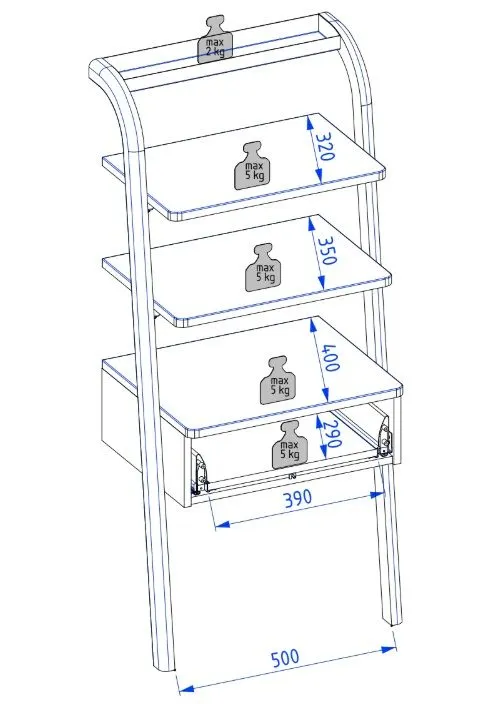 - Praktyczne przechowywanie: Dwie otwarte półki, pojemna szuflada oraz górna, metalowa półka na najpotrzebniejsze akcesoria.
