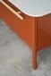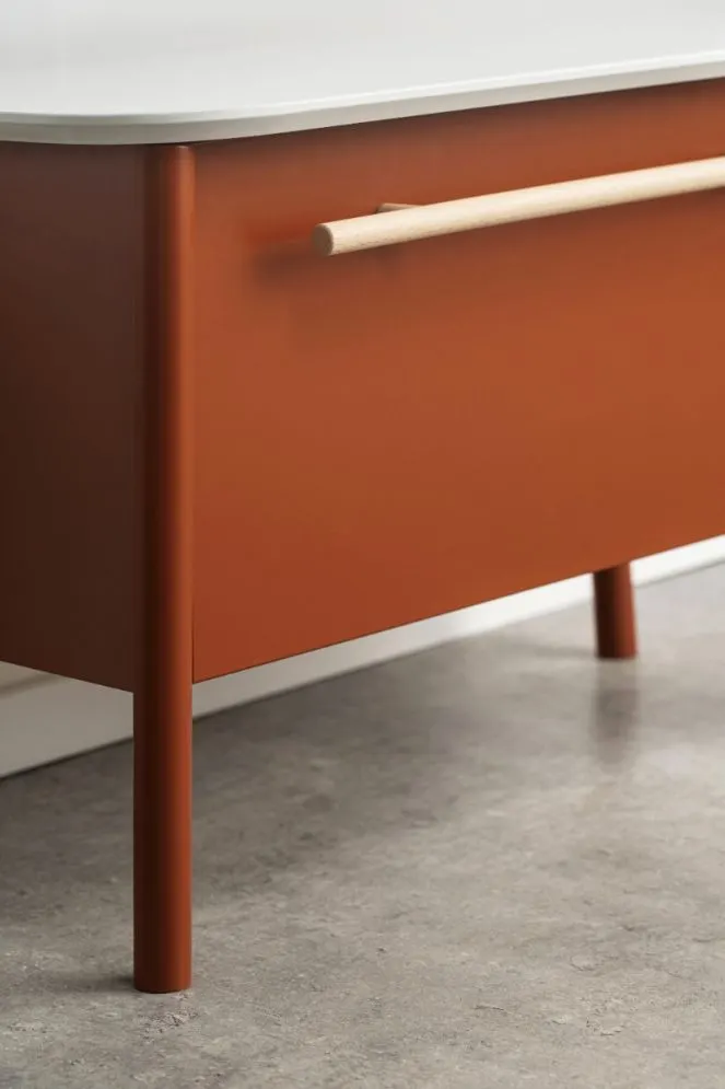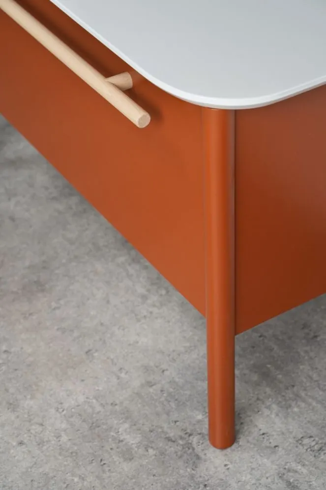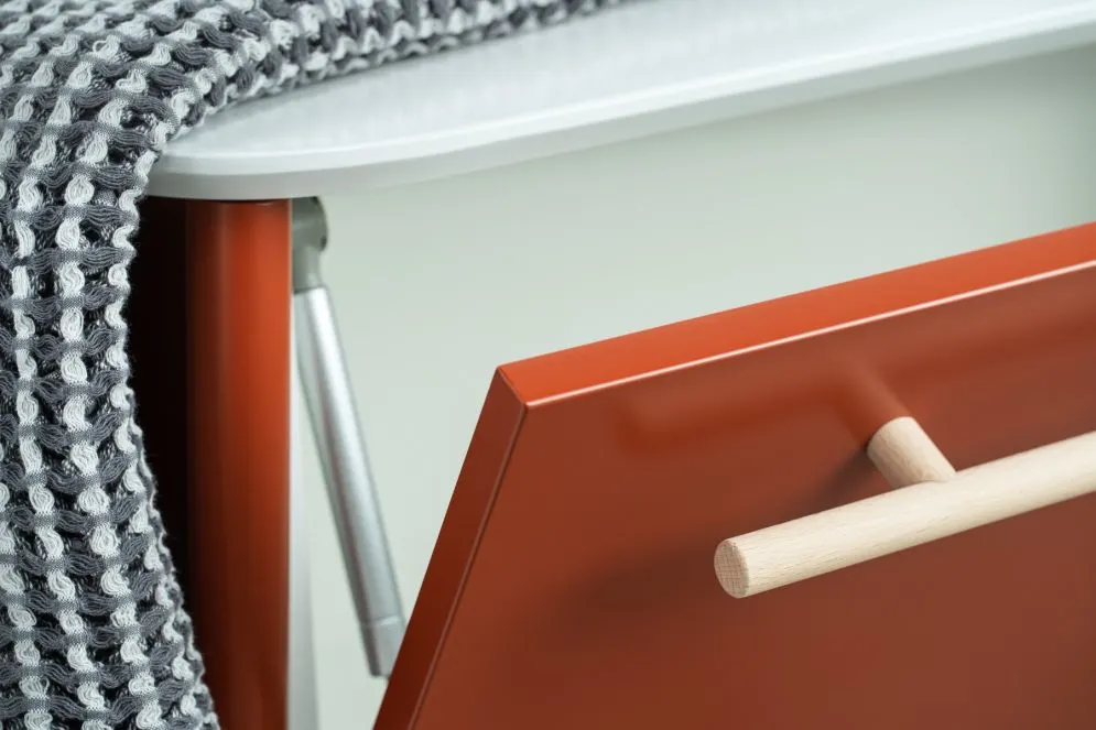 - Szlachetne materiały: Elementy z naturalnego drewna bukowego i solidna konstrukcja w odważnym kolorze terakoty.