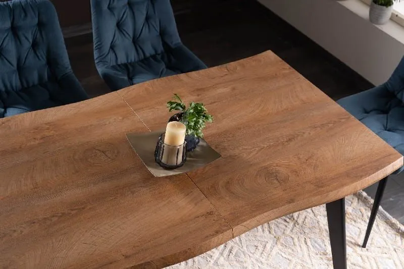 Nietypowy, lekko falowany kształt dłuższych krawędzi blatu wyróżnia ten model na tle innych. To subtelne nawiązanie do naturalnych form drewna, które sprawia, że stół staje się główną ozdobą jadalni.