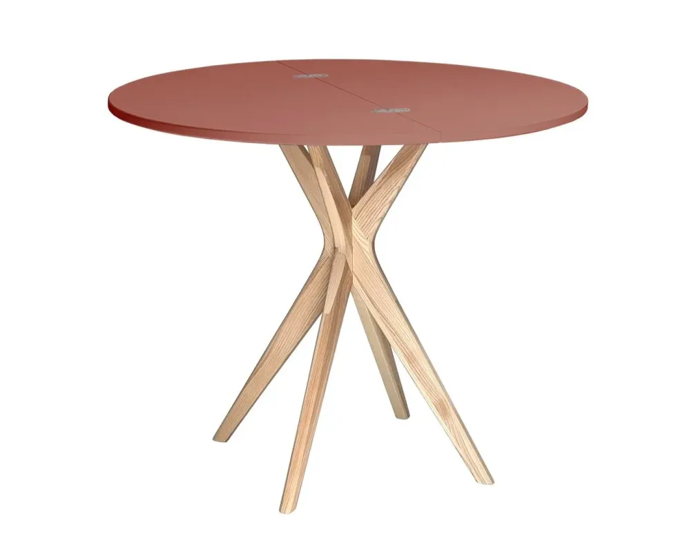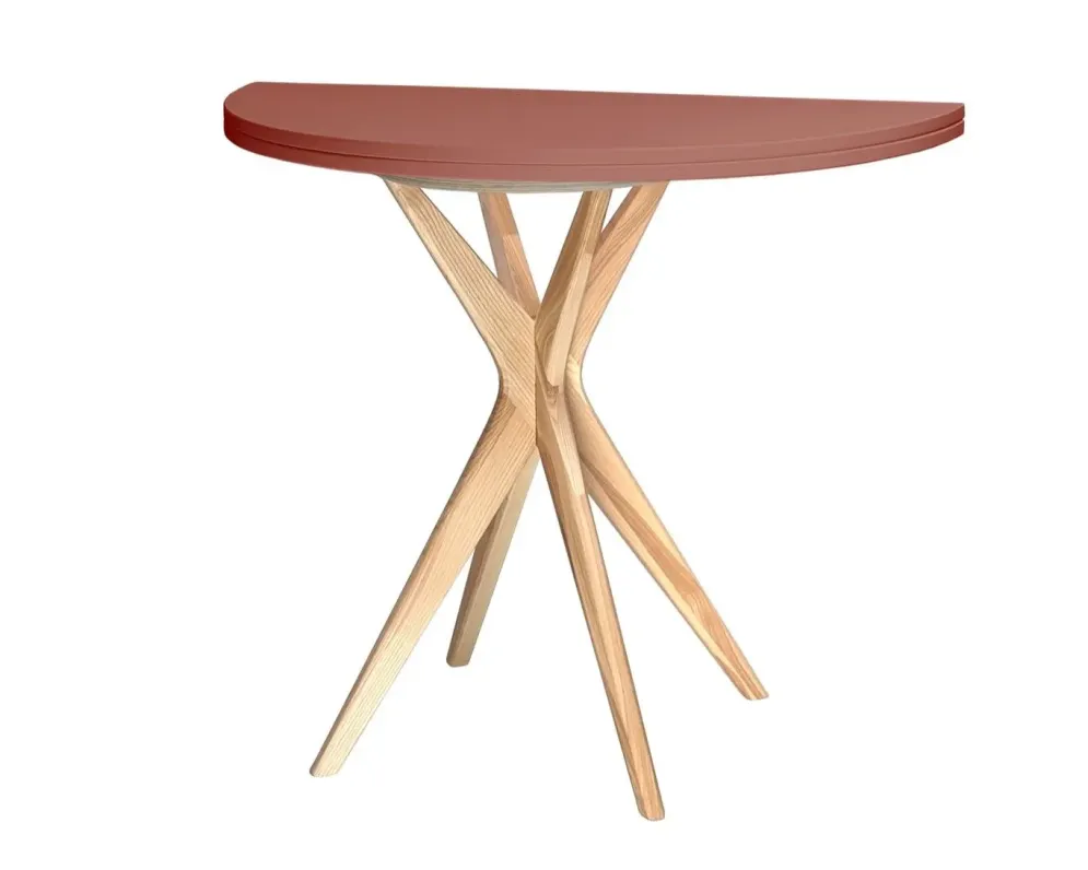 Skandynawski stół CUTTI z rozkładanym półokrągłym blatem w kolorze koralowym
