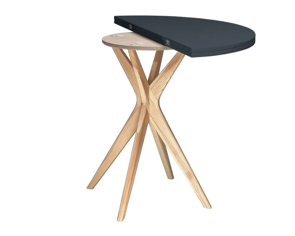 Wykonany z laminowanej i lakierowanej płyty MDF blat cechuje się wysoką odpornością na użytkowanie – nie straszne mu zarysowania, zmienna temperatura czy wilgoć. Jego matowa powierzchnia jest gładka i łatwa do utrzymania w czystości. Dzięki półokrągłej formie, stół można ustawić przy ścianie, by pełnił funkcję konsoli lub niewielkiego stołu dla dwóch osób. Po rozłożeniu staje się wygodnym miejscem dla czterech użytkowników – świetna opcja do mniejszych przestrzeni.