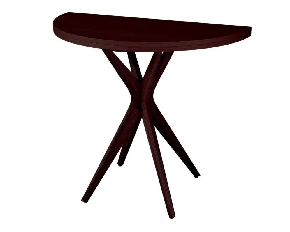 CUTTI zachowuje swoją praktyczność – jako półokrągła konsola doskonale sprawdzi się w małej kuchni, holu czy salonie, natomiast po rozłożeniu staje się pełnoprawnym stołem dla czterech osób. Stabilna konstrukcja oparta na krzyżowych nogach gwarantuje trwałość, a brak oskrzyni zwiększa ergonomię. Regulowane stopki umożliwiają idealne dopasowanie do każdej podłogi. Stół w wybarwieniu orzechowym to harmonijne połączenie wysokiej jakości wykonania z klasyczną estetyką drewna.
