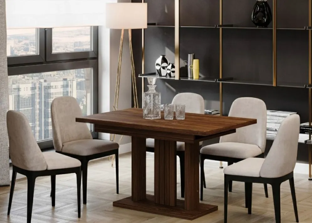 Stół wyposażony został w dwie wkładki powiększające o długości 40 cm, przechowywane praktycznie pod blatem. Po rozłożeniu mebel osiąga maksymalną długość 210 cm, co pozwala na komfortowe ugoszczenie nawet 8 osób – idealne rozwiązanie na rodzinne obiady czy spotkania z przyjaciółmi. Dzięki zastosowaniu prowadnic synchronicznych, rozkładanie stołu jest wyjątkowo łatwe i intuicyjne – wystarczy pociągnąć za jedną część blatu, a druga automatycznie rozsuwa się w tym samym czasie.