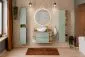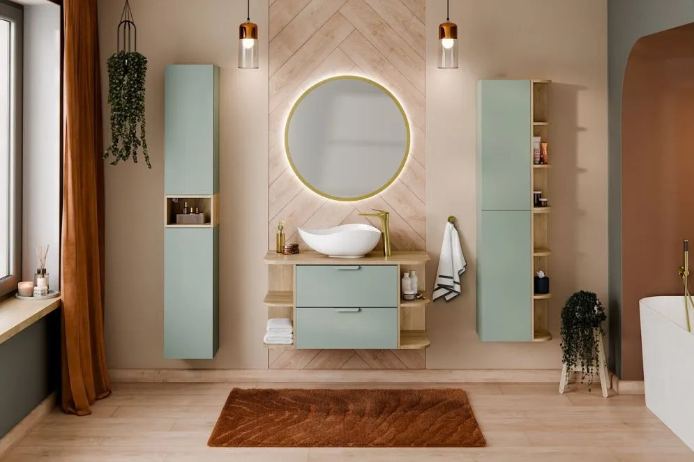 Stwórz unikalną i funkcjonalną zabudowę w swojej łazience dzięki zestawowi, który łączy kojący mat zieleni z naturalnym odcieniem drewna. Ten komplet to nie tylko miejsce do przechowywania, to element dekoracyjny, który nadaje wnętrzu nowoczesny, ekologiczny charakter.