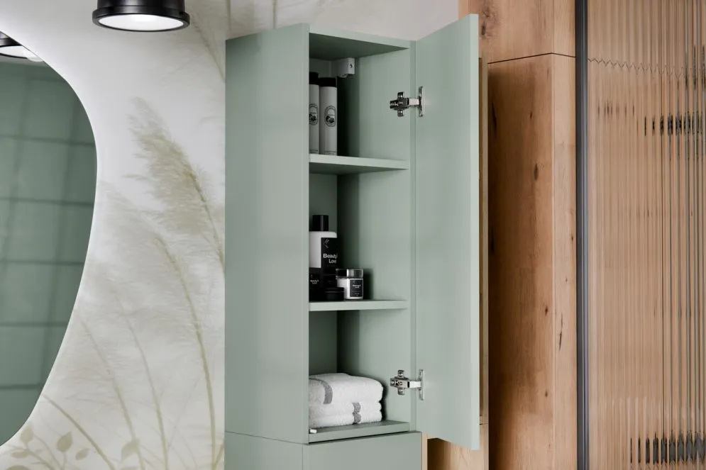 - Szafka wisząca ASTER GREEN 30 cm: Minimalistyczny półsłupek w kolorze Aloes z systemem push to open i cichym domykiem.