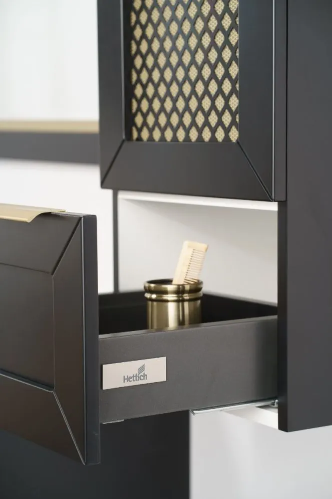 - Najwyższą jakość: Niezawodne systemy cichego domyku Hettich Atira w szufladzie oraz mechanizm "push-to-open" w drzwiczkach.
