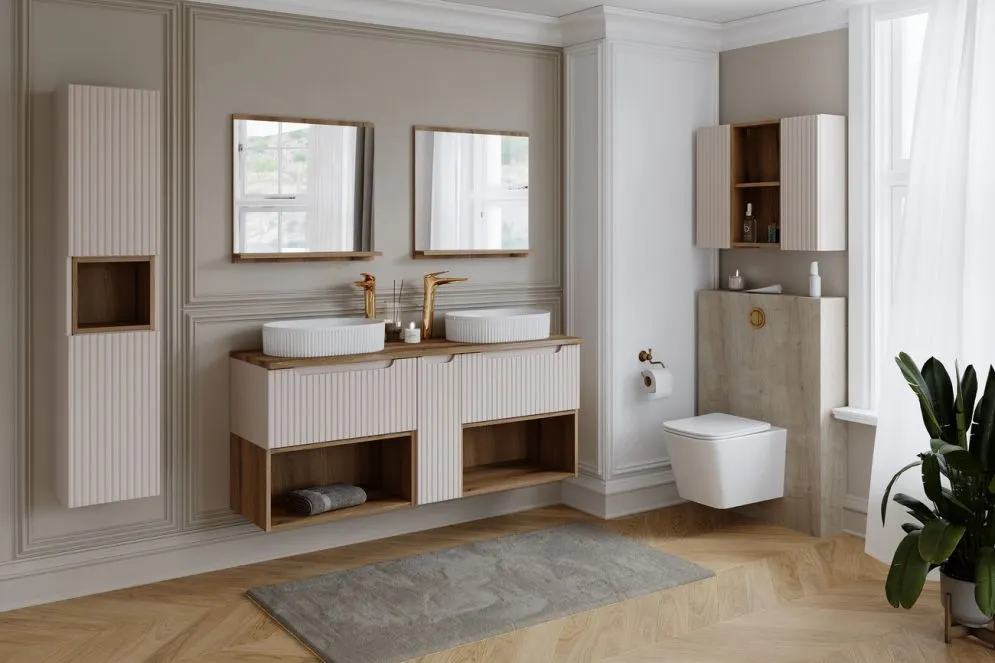 - Cenisz naturalne akcenty: Kolor dąb coast evoke z wyraźnym rysunkiem drewna wprowadza do łazienki przytulną, relaksującą atmosferę domowego spa.