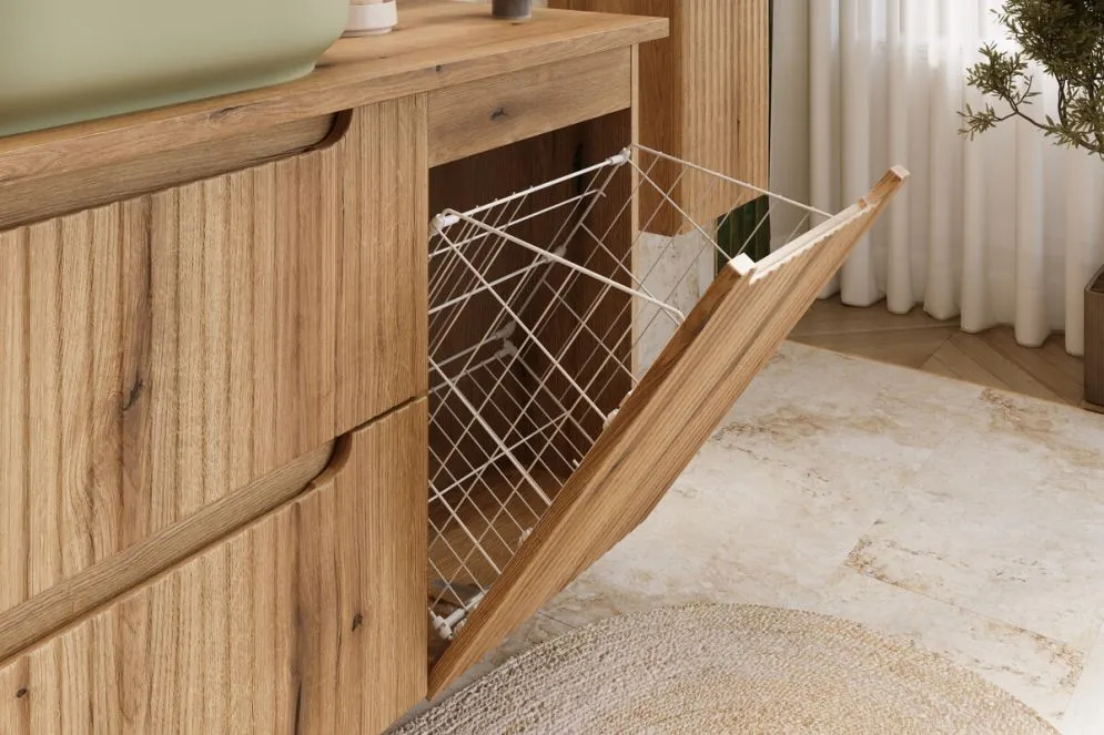 Wybierz szafkę NOVA COAST EVOKE 1D, aby połączyć codzienne potrzeby z wyjątkowym designem – to mebel, który nie tylko ułatwi Ci segregację prania, ale stanie się stylowym, naturalnym akcentem Twojej nowoczesnej łazienki.