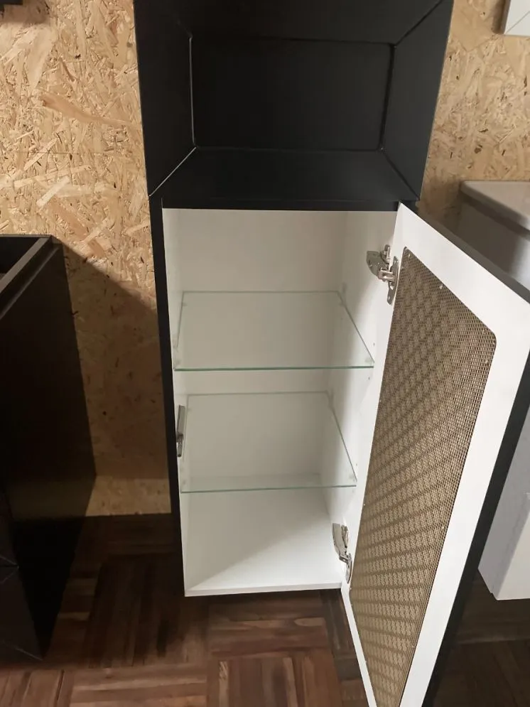 - Praktyczne przechowywanie: Dwie szklane półki wewnątrz szafki pomogą Ci zorganizować przestrzeń.