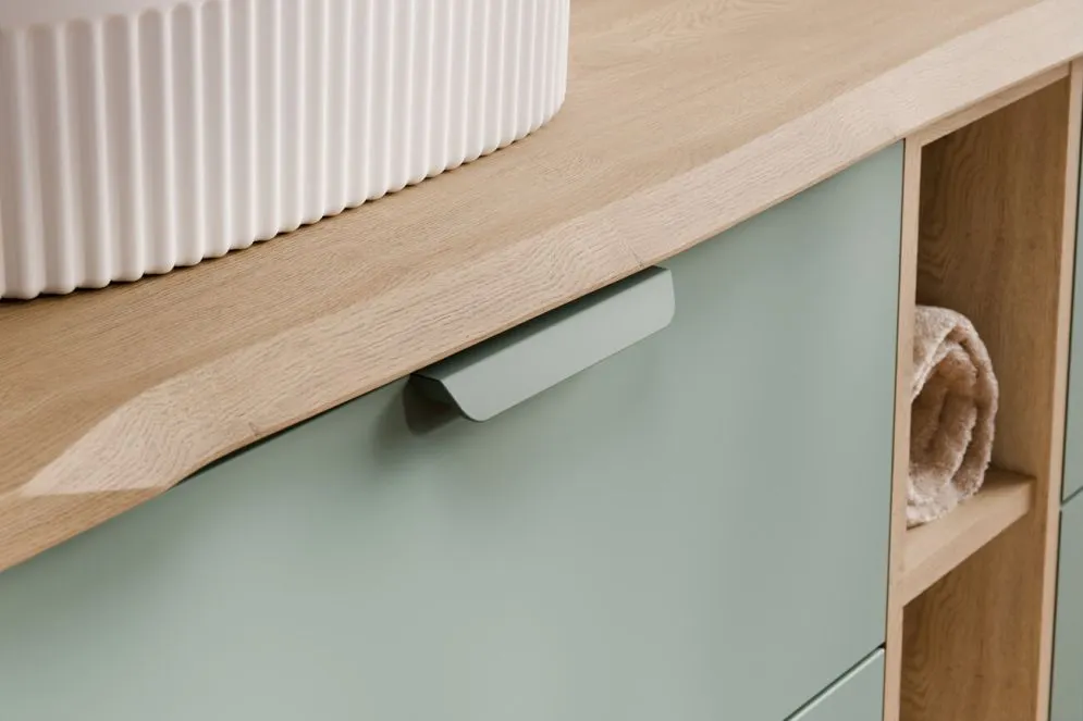 Wybierz szafkę pod umywalkę ASTER GREEN 2S 60 cm, aby wprowadzić do swojej łazienki kojący kolor natury w nowoczesnej oprawie. To trwały, polski mebel, który łączy minimalistyczny styl z najwyższą funkcjonalnością i szerokimi możliwościami personalizacji.