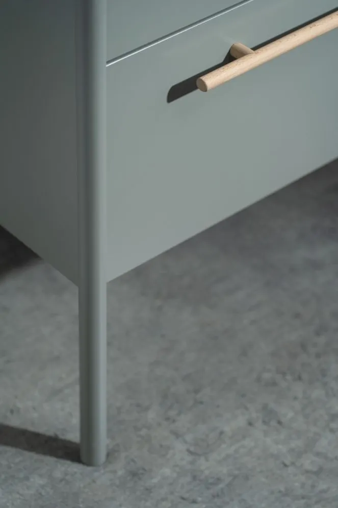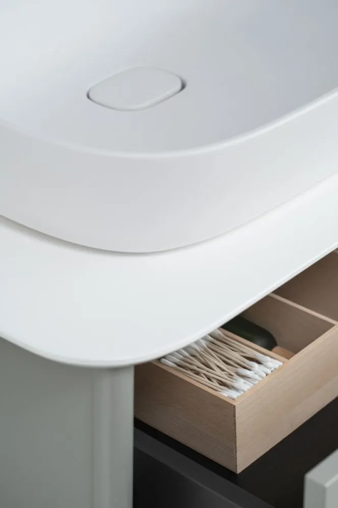 Tym, co wyróżnia szafkę DUKLA, jest jej unikalny design. Trapezowa bryła osadzona na smukłych, lakierowanych nogach z litego drewna bukowego nawiązuje do stylu vintage. Blat wykonano ze szlachetnego, matowego materiału Solid Surface, który jest nie tylko trwały i łatwy w czyszczeniu, ale także idealnie komponuje się z dedykowaną umywalką DUKLA o kształcie inspirowanym rzecznym otoczakiem (dostępna w opcjach dodatkowych). Dopełnieniem całości są długie, subtelne uchwyty, również wykonane z naturalnego drewna bukowego.