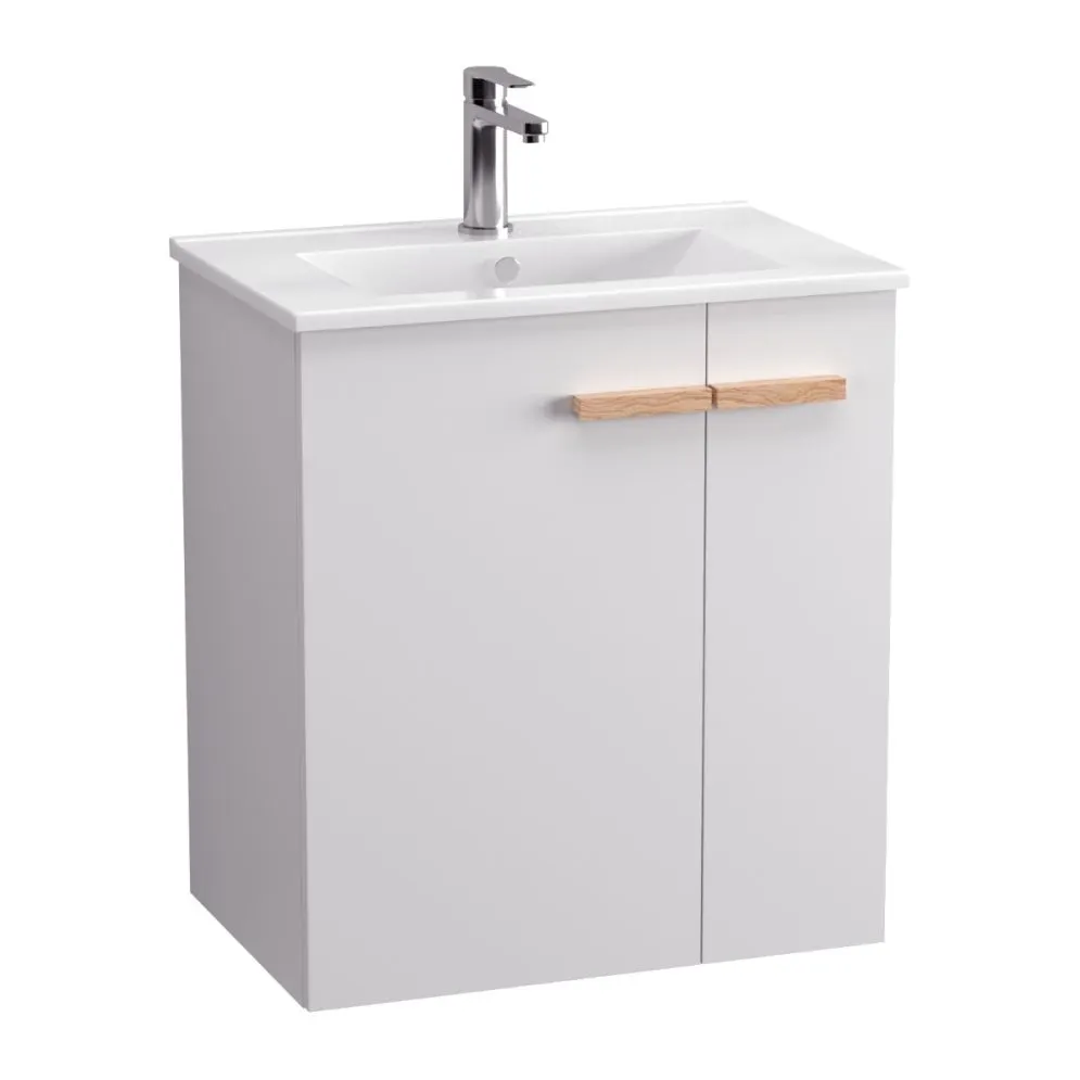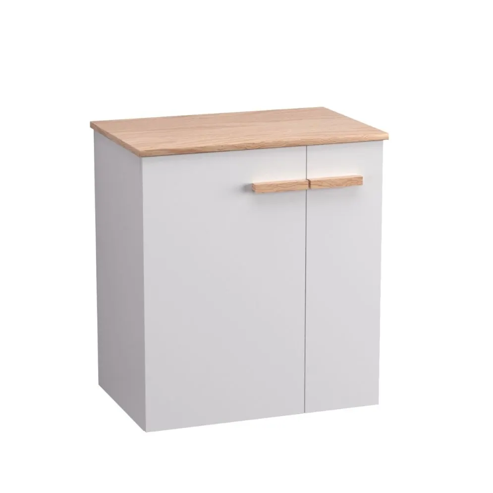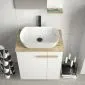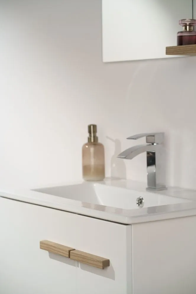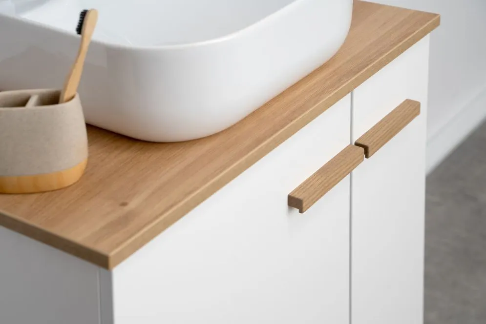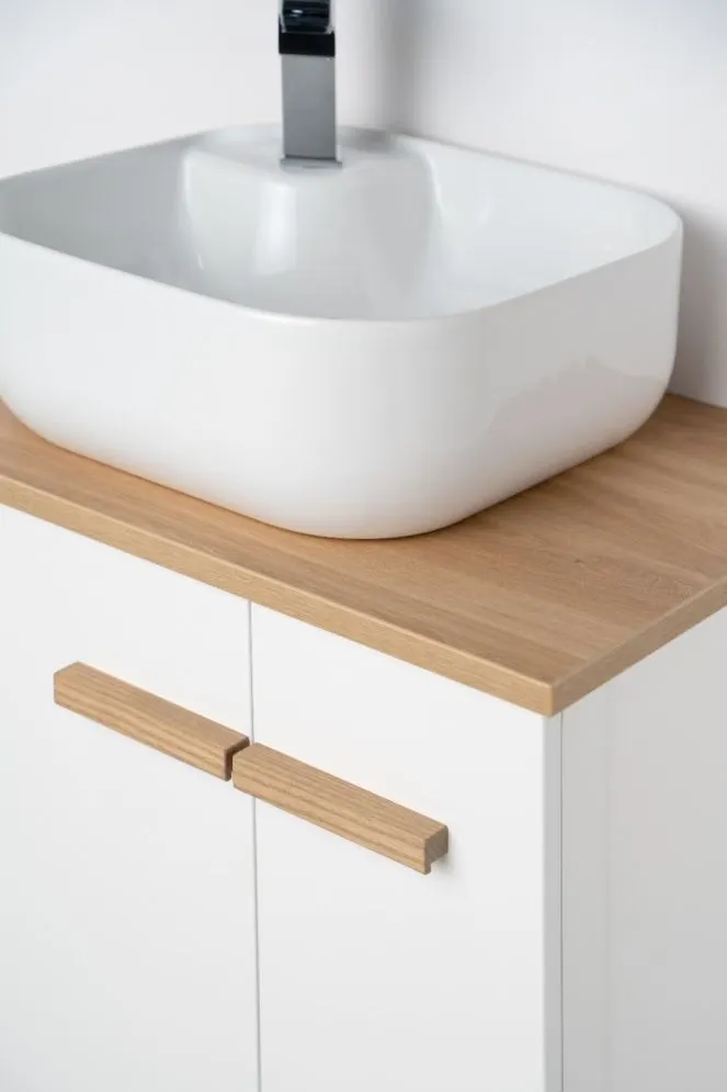 Szafka daje Ci pełną swobodę aranżacji. Możesz ją połączyć z dedykowaną umywalką ceramiczną LAU60, tworząc klasyczny zestaw. Jeśli wolisz bardziej nowoczesne rozwiązania, dokup blat w kolorze dębu castello i postaw na nim dowolną umywalkę nablatową.