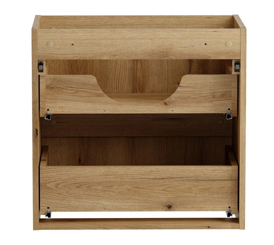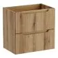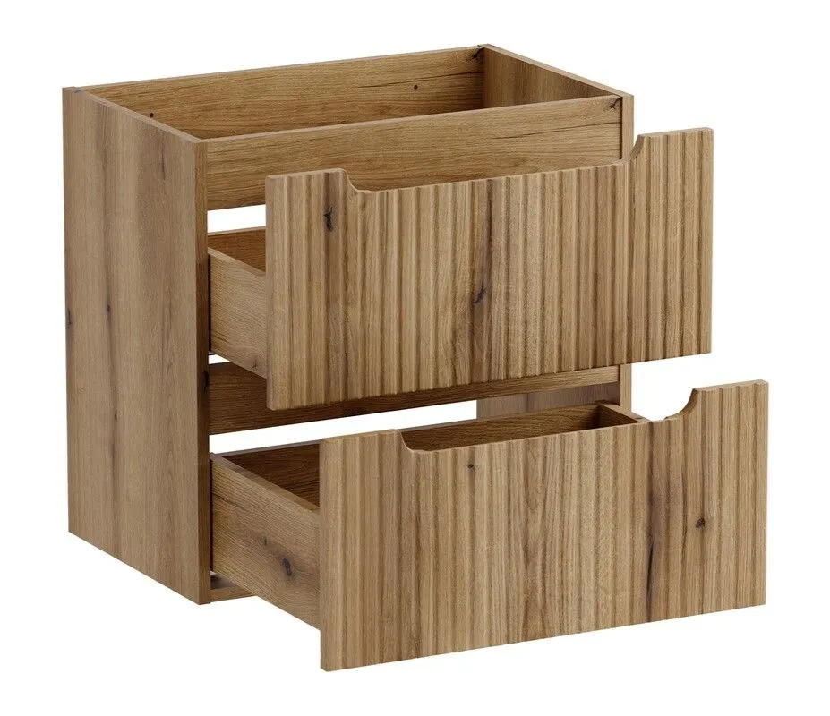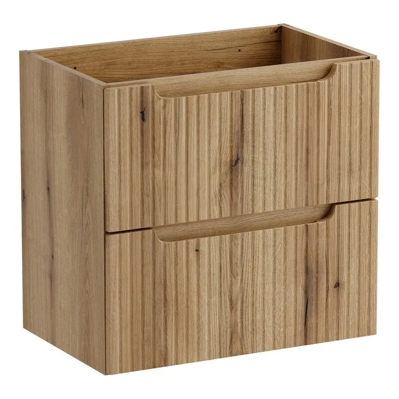Korpusy wykonane są z trwałej i solidnej laminowanej płyty, natomiast ryflowane fronty z płyty MDF. Obie płyty użyte do produkcji zestawu charakteryzują się bardzo dobrą odpornością na wilgoć, co jest szczególnie ważne w takim pomieszczeniu jak łazienka, gdzie panuje ciepły i wilgotny klimat. Cały zestaw został utrzymany w szlachetnym odcieniu dąb coast evoke, który doskonale imituje naturalne drewno. Ryflowania na frontach dodają meblom dynamiki, a brak tradycyjnych uchwytów – zastąpionych ergonomicznymi frezowaniami – podkreśla minimalistyczny i nowoczesny charakter kompletu.