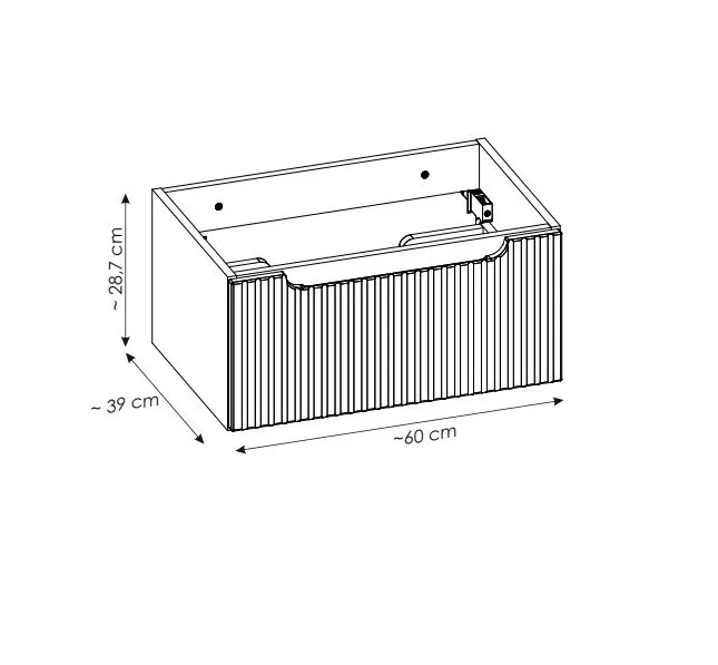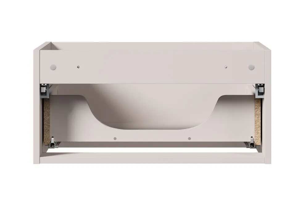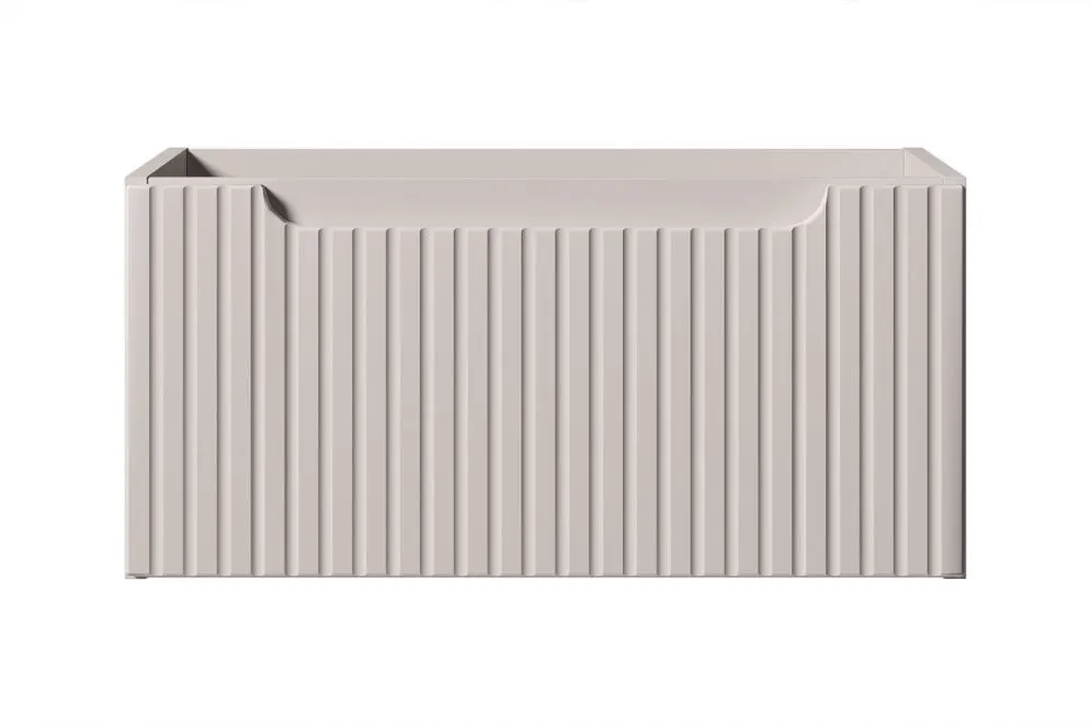 Front szafki wykonany z płyty MDF oraz korpus z płyty laminowanej 16 mm gwarantują wytrzymałość i estetykę na lata. Zintegrowany, frezowany podchwyt subtelnie podkreśla minimalistyczną linię mebla, eliminując potrzebę montażu tradycyjnych uchwytów. Każdy element został zaprojektowany z dbałością o detale, co potwierdza polska produkcja oraz certyfikat FSC.